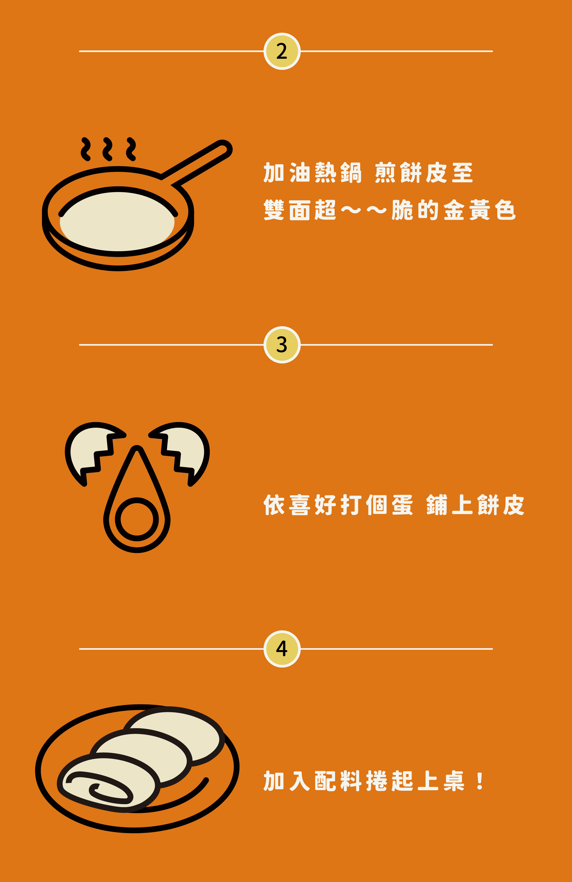 每包內餡建議製作兩份蛋餅,剩餘餅皮還可以拿來做起司蛋餅唷。